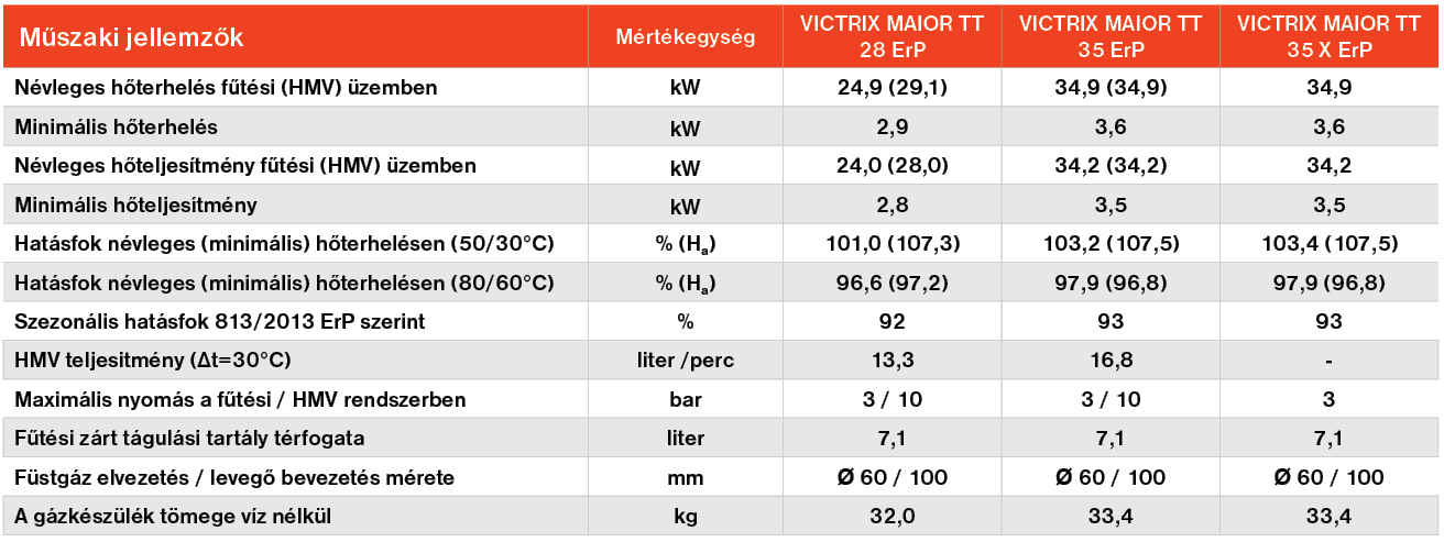 A VICTRIX MAIOR TT ErP család kitűnő választás fűtéskorszerüsítéshez, vagy akár új rendszerekhez való telepítéshez. A teljes sorozatot úgy tervezték, hogy mindenben megfeleljen a legfrissebb európai direktíváknak és mindamellett növelje a kondenzációs technológia elterjedését azáltal, hogy egy könnyen elérhető magas hatásfokú fűtő és használati melegvíz készítő terméket képvisel a lakossági felhasználásban.